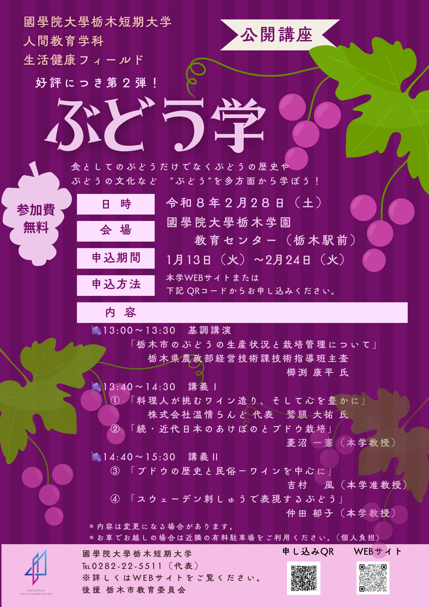 | 問い合わせ先 | 〒328-8588 栃木県栃木市平井町608番地 國學院大學栃木短期大学 公開講座係 電話 0282-22-5511(代) [平日]9:00~15:00 [土曜日]9:00~13:00 |