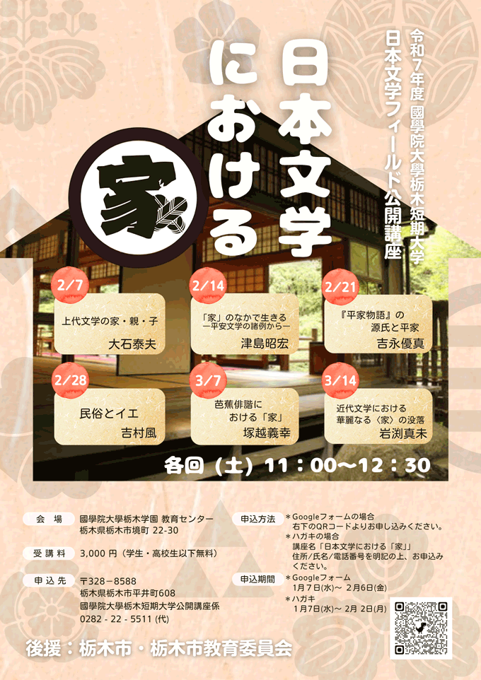| 申込先 | 〒328-8588 栃木県栃木市平井町608番地 國學院大學栃木短期大学 公開講座係 電話 0282-22-5511(代) |