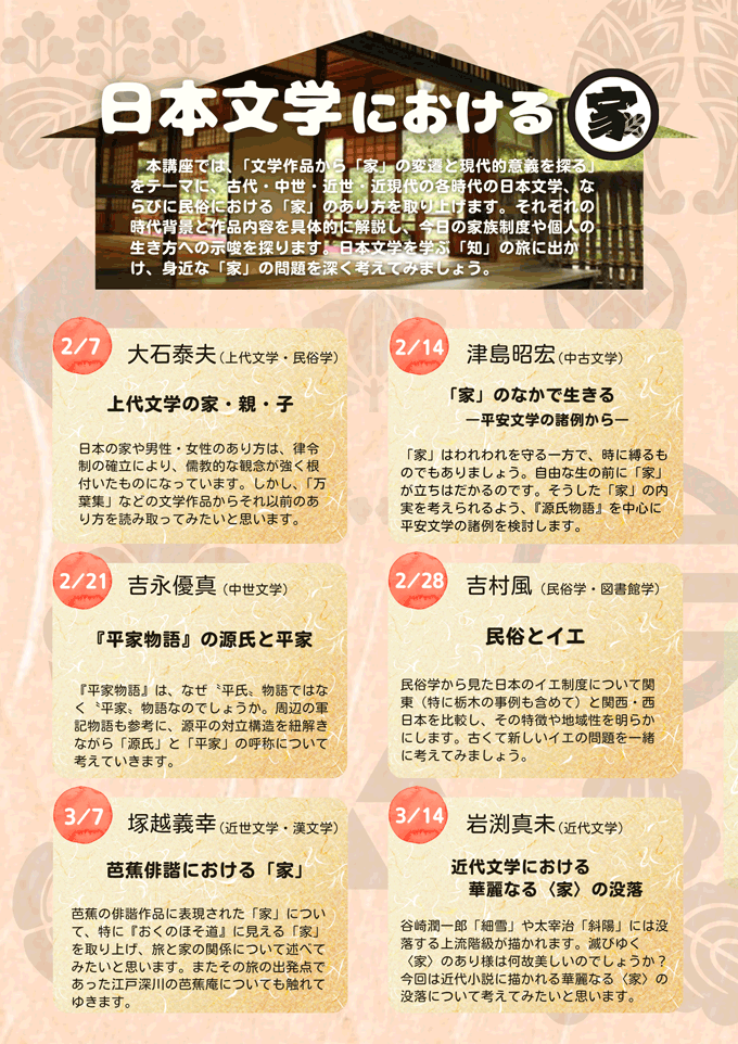 | 申込方法 | ハガキまたは申込フォーム からお申し込みください。 ハガキの場合は、講座名(「日本文学における「家」)と住所・氏名・電話番号を明記し、下記宛にお申し込みください。 |
